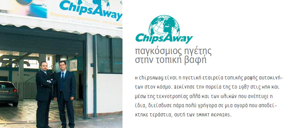 Η μοναδικότητα των υλικών, σε συνάρτηση με την ποιότητα των αποτελεσμάτων, τις ανταγωνιστικές τιμές, την αυθημερόν παράδοση των οχημάτων και την φιλική εξυπηρέτηση, έχουν καταστήσει την ChipsAway ηγέτιδα δύναμη, στο χώρο της τοπικής βαφής, και στην Ελληνική αγορά.